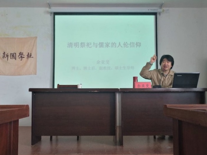 首先是“清明节与中国的祭祀传统”。在这一部分里,余老师分别介绍了祭祀的起源,目的以及对象三个方面。他指出祭祀的传统渊远悠长,起源于周代,是中国的三大鬼节之一。人们祭祀是出于对已逝者的怀念与不舍之情。并且着重叙述了祭祀的对象——天地山川神灵以及自己的祖先,表达出了古人对天地自然的敬畏之情以及儒家伦理道德的传承。其次以”信仰”为话题讲述了中国传统的信仰世界。围绕着这一话题,余老师从”何谓信仰”,人为什么需要信仰以及信仰的作用,传达了中国传统文化的信仰对人们的重要意义。他指出,儒家信仰相对于道,佛两家而言,更注重对人伦道德的延续,提倡“小我“寓于”大我”的价值观,强调通过对他人的奉献获得人的价值意义的观点。进一步论证了清明祭祀与儒家伦理道德的关系。最后从“生命存在感的确认”“道德责任的确立”以及“良心的内省与发用”三个角度回答了清明祭祀之于伦理道德的深刻意义。