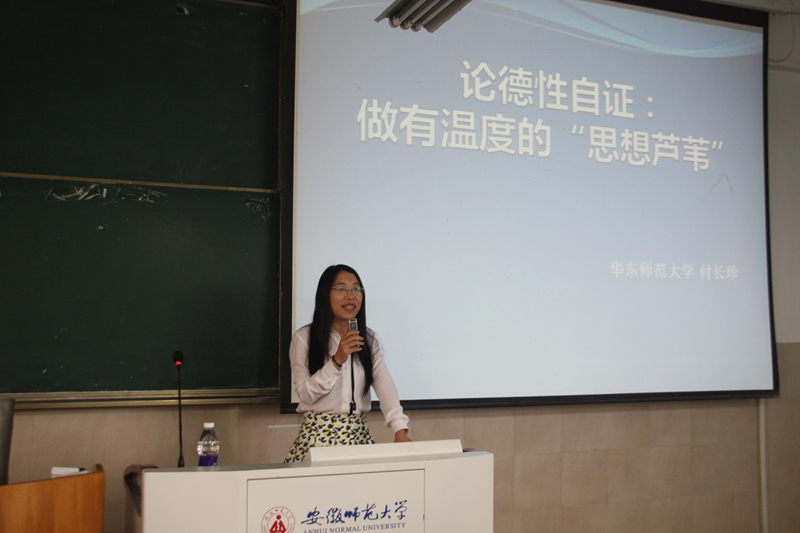本网讯(文/吴梦 摄/范冉冉)5月27日下午,华东师范大学哲学系教授、博士生导师付长珍教授做客花津学术论坛,于教学楼2020203主讲“论德性自证:做有温度的‘思想芦苇’”。本次讲座由政治公司吴先伍教授主持,戴兆国教授、王振钰副教授和2014级政教专业全体学子一同到场聆听。