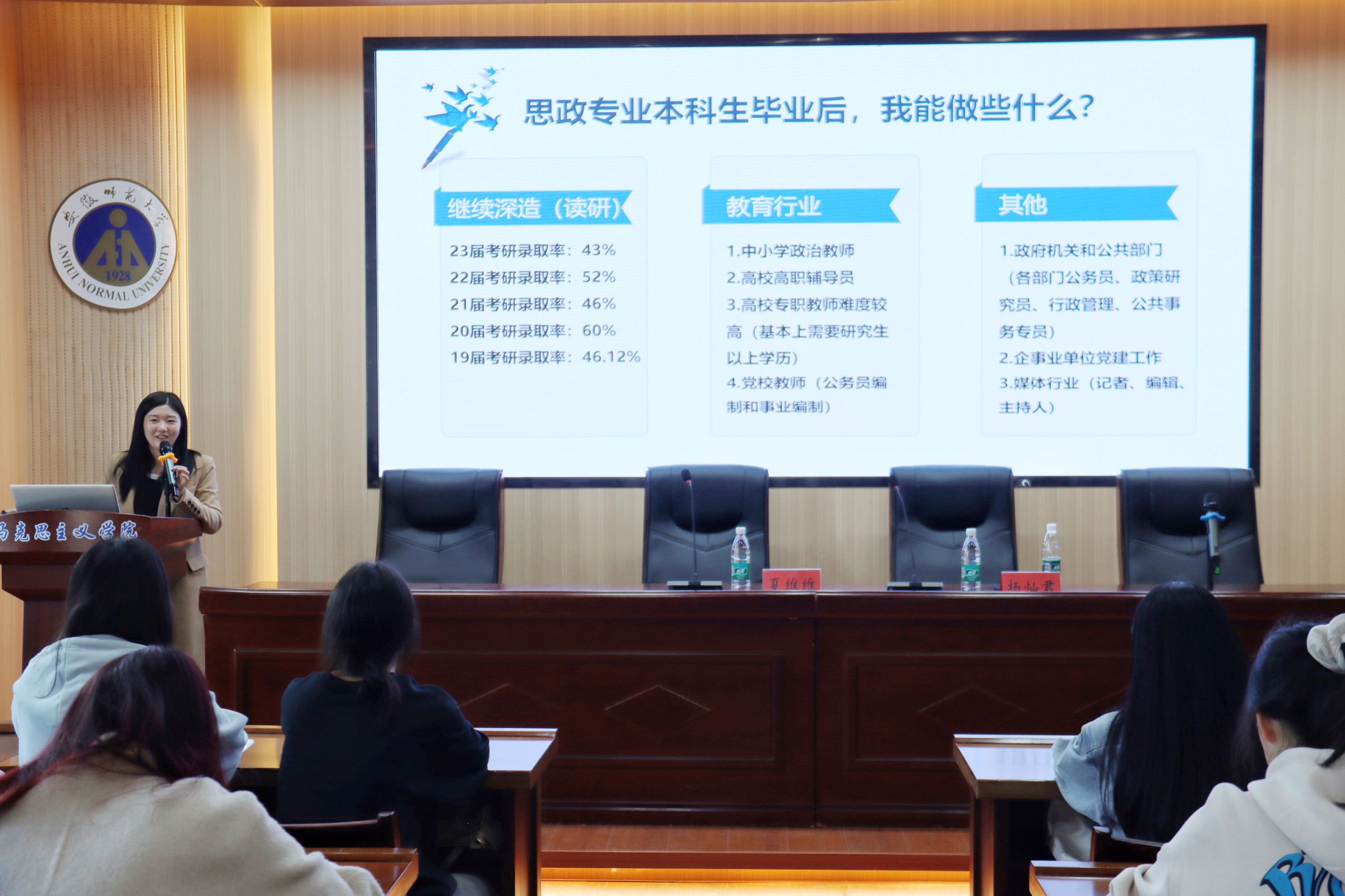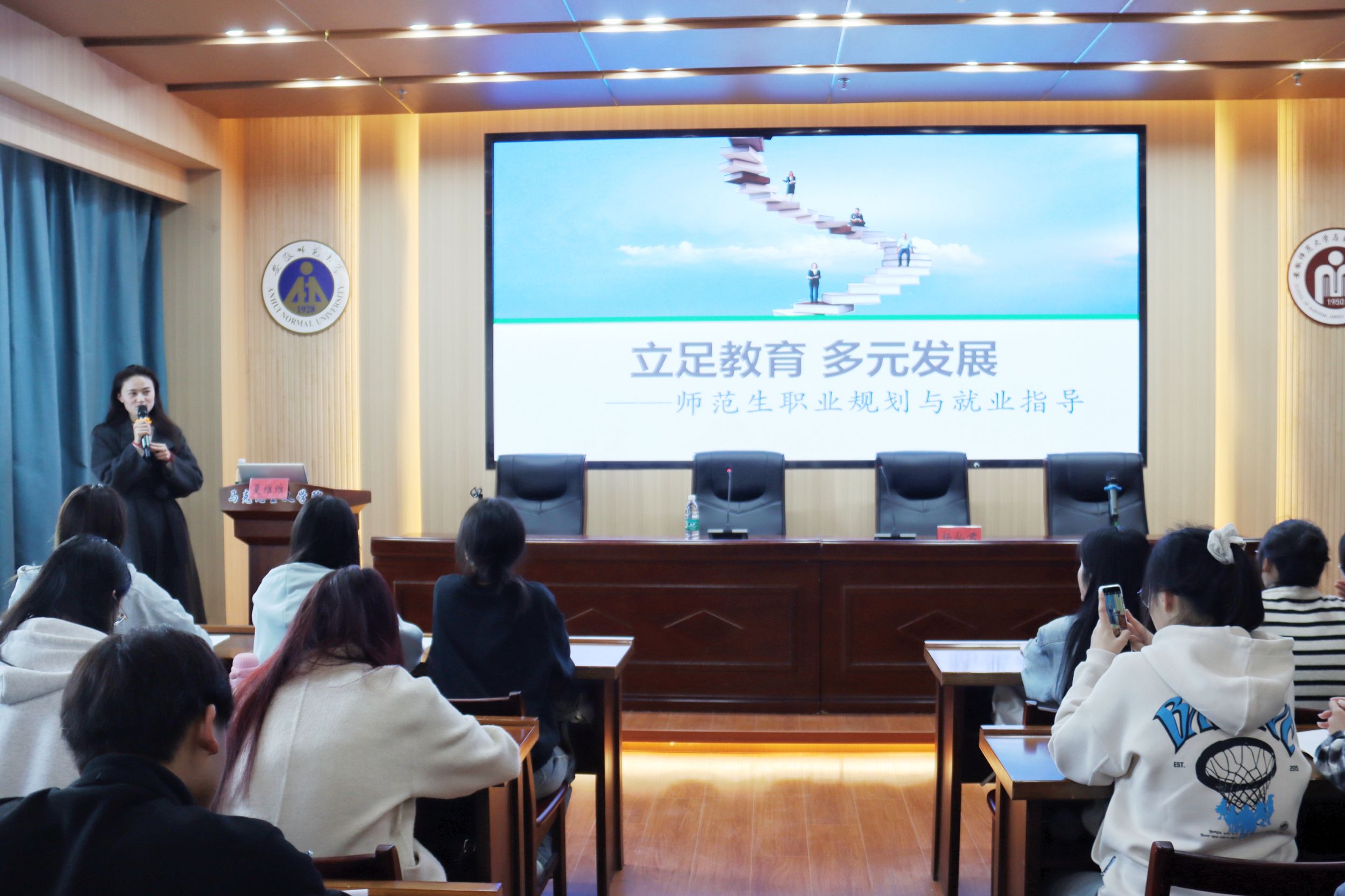 会上,杨灿君开展了以“师范生专业成长与就业指导”为主题的报告,分别从师范生就业前景、就业渠道、职业发展与个人发展三个方面进行经验分享,重点介绍了求职过程中的相关注意事项。夏维维以“立足教育 多元发展”为话题,结合自身经历,从做好职业规划和做好职业准备两部分与同学们进行交流探讨,主要介绍个人能力的评估与探索、行动计划的制定以及求职过程中需要着重注意的一系列问题。会后,同学们纷纷表示指导会的经验分享和指导意见对自己有很大的帮助,增强了个人求职信心。