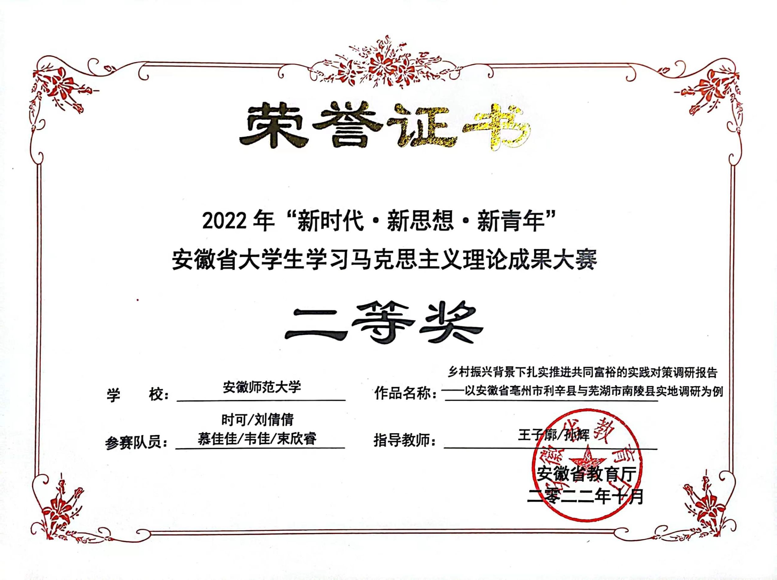 她提升综合能力,积极参加各类校院素质拓展活动,累计获得奖项20余次。她坚持理论与实践相结合,主动带领团队深入亳州市利辛县马店孜镇进行社会调查,积极撰写实习调研报告,实现知识的“内化于心,外化于行”。她坚持知行合一,积极奉献自己的青春力量。