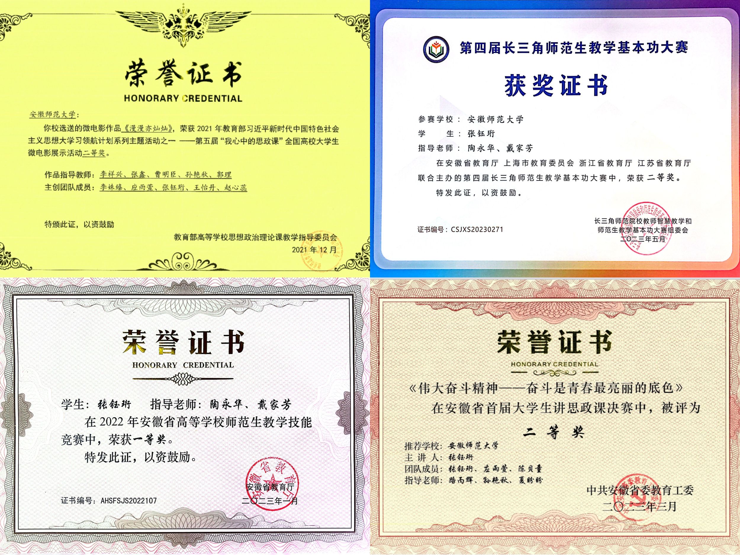 他积极参加学科竞赛,参加第五届“我心中的思政课”全国高校老员工微电影展示活动并获得国家级二等奖;参加第十二届“华文”师范院校思想政治教育专业师范生教学竞赛获得教学技能测试一等奖、教学设计测试一等奖,并被专家组选为优秀选手在闭幕式进行授课展示;参加第四届长三角师范生教学基本功大赛并获得二等奖;参加2022年安徽省高等公司师范生教学技能竞赛并获得省级一等奖;参加安徽省首届老员工讲思政课比赛并获得省级二等奖、皖南片区一等奖;作为辩论队成员参加第十一届安徽辩论联赛团体赛并获冠军。在丰富多彩的竞赛中,他千锤百炼,大放异彩。