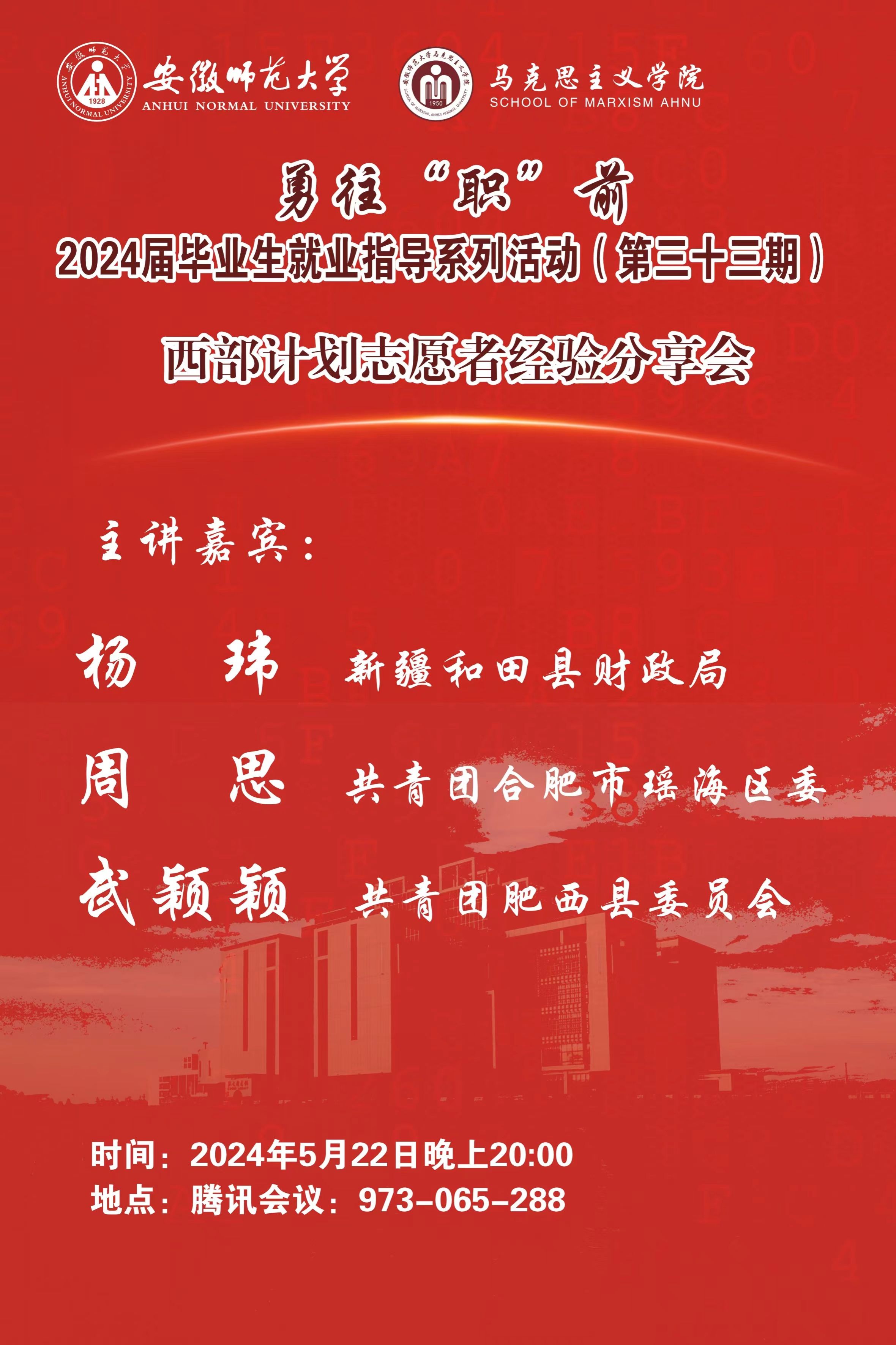 为进一步促进员工就业,鼓励广大毕业生投身基层建设,实现个人价值与社会价值的双重提升,2024年5月22日,公司组织召开西部计划志愿者经验分享会。本次活动由2023届法学专业毕业生周思、杨玮主讲,2020级思想政治教育专业本科生乔婷婷主持。