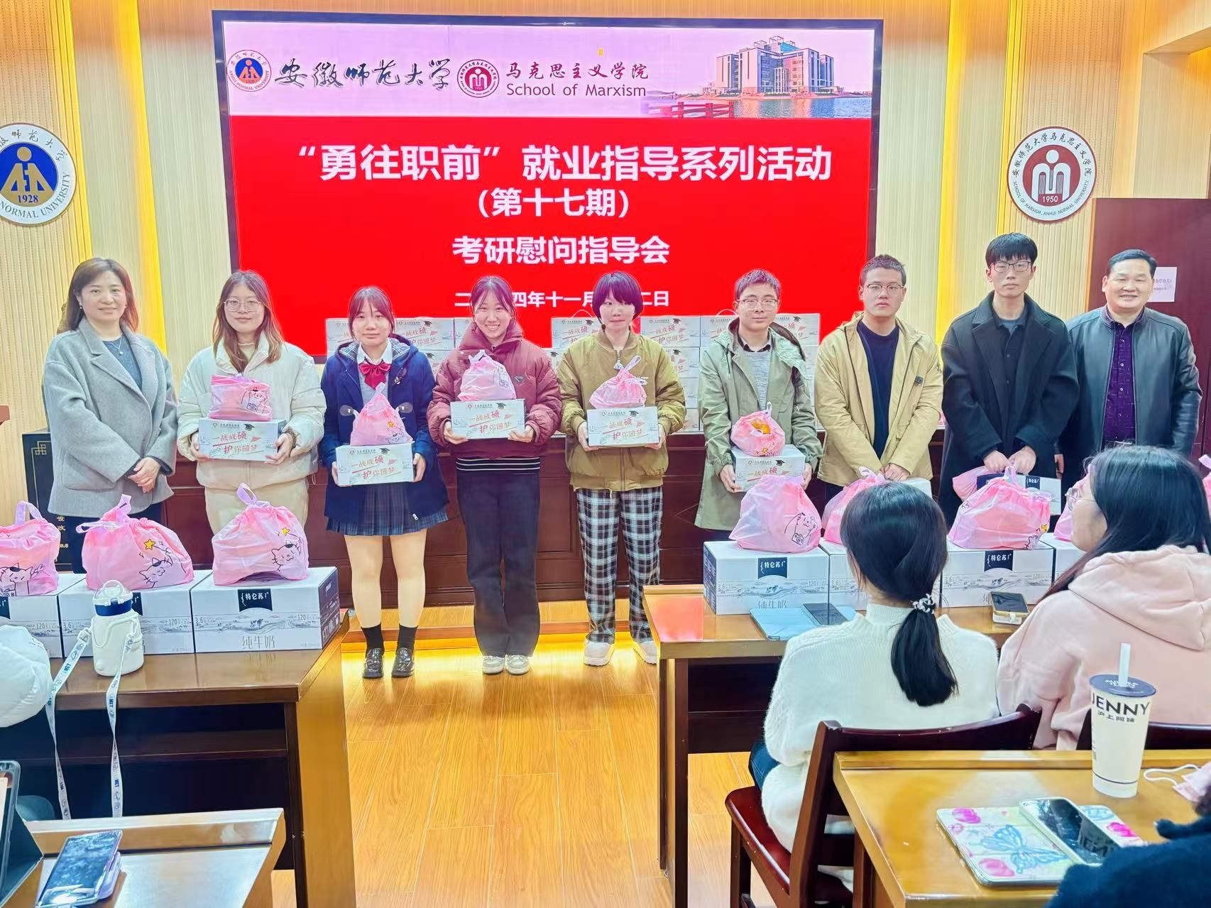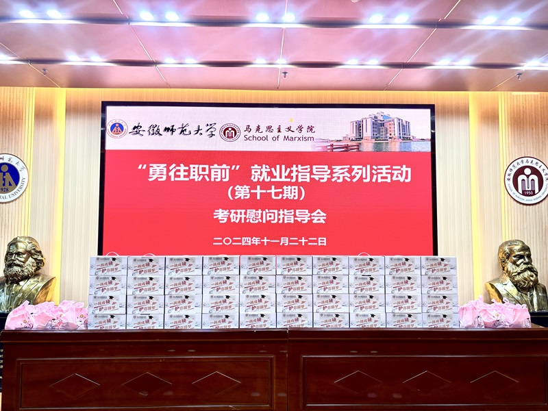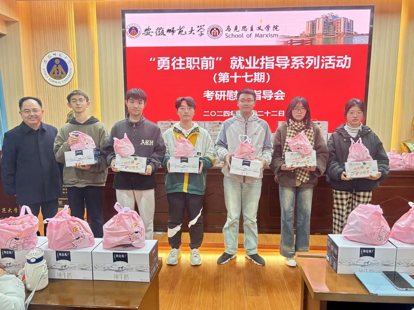 三位领导老师共同为考研学子发放牛奶、大礼包等暖心慰问品,亲切地和同学们交流,为同学们送上最真诚的祝福。