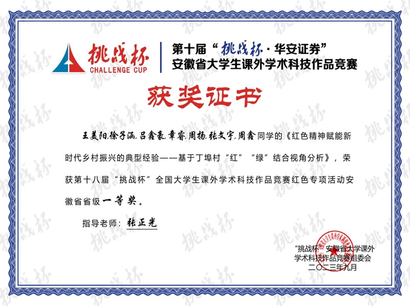 他始终重视培养自己的科研素养与能力,保持浓厚的学科兴趣,积极关注思考时事政治和社会实际。他作为第一负责人申报了《土地革命时期毛泽东调查研究方法及其现实启示》老员工创新创业训练项目计划并获国家级立项,他所参与的《红色精神赋能新时代乡村振兴的典型经验——基于丁埠村“红”“绿”结合视角分析》获第十八届“挑战杯”全国老员工课外学术科技作品竞赛红色专项活动安徽省省级一等奖。