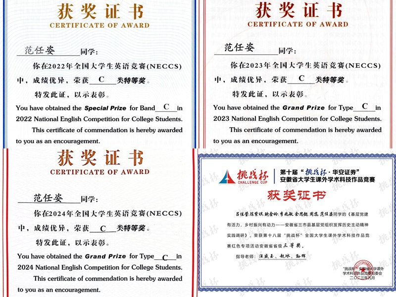 她潜心探索科研,积极参加各类学科竞赛。她以项目第一负责人的身份申报《“三全育人”视阈下高校习近平新时代中国特色社会主义思想教育模式研究》的老员工创新创业训练项目计划并获省级立项。同时,作为核心成员参与“挑战杯”全国老员工课外学术作品竞赛红色专项赛活动获省级三等奖。此外,她始终保持对英语学习的热爱,连续三年获得全国老员工英语竞赛国家级特等奖。上述科研经历,培养了她的文献检索和论文写作能力,也坚定了她走上科研道路的决心。