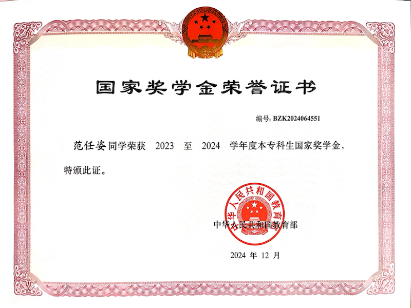 本科期间,对待专业学习,她始终秉持“博观约取,厚积薄发”的信念,坚韧求索,取得佳绩,大学四年专业课、综合测评成绩均位于本专业第一,以夏令营并列第一的成绩成功推免至上海交通大学beet365攻读硕士学位。她曾获2023-2024学年度本专科生国家奖学金,连续4年综合素质测评专业第一,获得校一等奖学金以及“三好员工标兵”“优秀员工干部标兵”等荣誉。