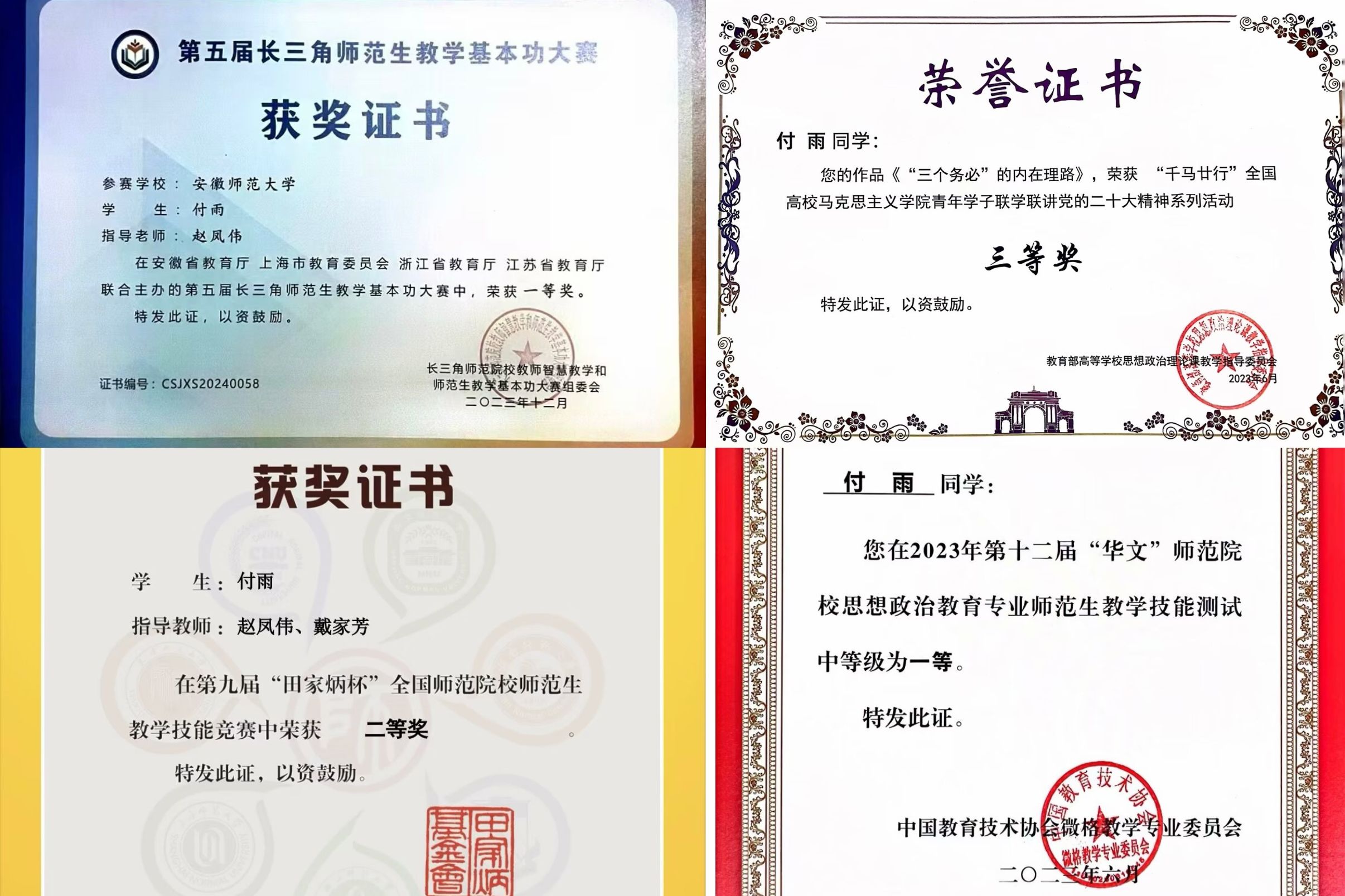 她始终将“成为一名有温度的引路人”作为自己的追求,秉持“以赛促学”的理念,积极参与各类学科竞赛,全面提升自身专业素养和教学能力。在第十二届“华文”师范院校思想政治教育专业师范技能测试中斩获两项国家级一等奖,第五届长三角师范生技能赛事中获一等奖,第九届“田家炳杯”全国师范院校师范生技能竞赛中获国家级二等奖,本科阶段获得A、B赛事国家级奖项5项,省级7项。从思政小课堂到社会大课堂,她努力站稳每一个讲台,让每一节政治课生动起来,做一名优秀且富有创造力的师范生。