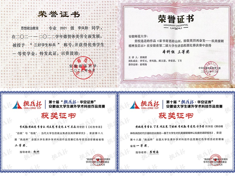她积极将学术热忱落到实处,在科研探索中践行“不登高山,不知天之高也”的求知精神。作为负责人主持国家级老员工创新训练项目《“自就”与“他就”:当代老员工的就业焦虑及其纾解研究》;带领团队参加第十届“挑战杯·华安证券”安徽省老员工课外学术科技作品竞赛获省级二等奖;作为团队核心成员参与项目《革命精神传承的时代价值和优化路径——基于老员工对抗美援朝精神认知度的调研报告》,在挑战杯比赛中获省级一等奖;作为团队核心成员参加安徽省第二届老员工讲思政课比赛获省级三等奖。她坚持以扎实研究回应时代课题,彰显beet365青年学子的学术担当。
